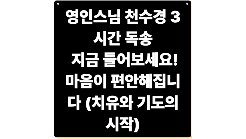 천수경은 단순한 경전 낭송이 아닙니다. 삶의 무게에 눌린 이들에게 휴식이 되고, 간절한 염원을 지닌 이들에게 기도의 문을 열어주는 소리입니다. 영인스님의 3시간 독송은 오랜 시간에 걸친 정성과 수행이 담긴 음성으로, 우리 내면의 깊은 고요함을 불러일으킵니다. 하루의 시작이든, 마무리든, 혹은 중요한 순간이든 천수경을 가까이 두고 꾸준히 들으신다면 분명히 마음의 변화와 삶의 여유를 느끼실 수 있을 것입니다. 이 글이 그런 길에 조금이라도 도움이 되기를 진심으로 바랍니다.